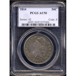 <TABLE cellSpacing=0 cellPadding=0 width="100%" bgColor=#000000 border=0><TBODY><TR><TD width="100%"><TABLE cellSpacing=1 cellPadding=3 width="100%" border=0><TBODY><TR><TD width="100%" bgColor=#79735c><FONT face=arial color=#ffffff size=3><B>Description</B> </FONT></TD></TR><TR><TD width="100%" bgColor=#ffffff><FONT face=arial size=2><B>1810 50C AU50 PCGS.</B></I> O-102a, R.2. Star 12 and the upper two arrowheads are recut. Glimpses of luster break through the original apple-green and mauve patina. The stars are well struck, although the eagle's left (facing) wing is softly struck. A problem-free example. </FONT></TD></TR></TBODY></TABLE></TD></TR></TBODY></TABLE><BR><A name=PricesRealized></A><TABLE cellSpacing=0 cellPadding=0 width="100%" bgColor=#000000 border=0><TBODY><TR><TD width="100%"><TABLE cellSpacing=1 cellPadding=3 width="100%" border=0><TBODY><TR><TD width="100%" bgColor=#79735c><A name=PR><FONT face=arial color=#ffffff size=3><B>Previous Prices from Heritage Auctions</B> </FONT></A></TD></TR><TR><TD bgColor=#f6f6ed><TABLE cellSpacing=0 cellPadding=0 width="100%" border=1><TBODY><TR><TD align=middle width="33%"><B>Date</B></TD><TD align=middle width="33%"><B>Service</B></TD><TD align=middle width="33%"><B>Price</B></TD></TR><TR bgColor=whitesmoke><TD width="33%"><B>02/23/2002</B></TD><TD width="33%">PCGS</TD><TD width="33%">$517.50</TD></TR><TR bgColor=whitesmoke><TD width="33%"><B>07/04/2000</B></TD><TD width="33%">ANACS</TD><TD width="33%">$320.00</TD></TR><TR bgColor=whitesmoke><TD width="33%"><B>01/13/2003</B></TD><TD width="33%">ANACS</TD><TD width="33%">$347.30</TD></TR><TR bgColor=whitesmoke><TD width="33%"><B>09/28/2002</B></TD><TD width="33%">ANACS</TD><TD width="33%">$322.00</TD></TR><TR bgColor=whitesmoke><TD width="33%"><B>07/30/2002</B></TD><TD width="33%">ANACS</TD><TD width="33%">$402.50</TD></TR><TR bgColor=whitesmoke><TD width="33%"><B>06/10/2002</B></TD><TD width="33%">ANACS</TD><TD width="33%">$368.00</TD></TR><TR bgColor=whitesmoke><TD width="33%"><B>09/10/1997</B></TD><TD width="33%">ANACS</TD><TD width="33%">$254.10</TD></TR><TR bgColor=whitesmoke><TD width="33%"><B>02/15/2000</B></TD><TD width="33%">ANACS</TD><TD width="33%">$460.00</TD></TR><TR bgColor=whitesmoke><TD width="33%"><B>03/01/2003</B></TD><TD width="33%">ANACS</TD><TD width="33%">$379.50</TD></TR></TBODY></TABLE></TD></TR><TR><TD bgColor=#ffffff><FONT face=arial size=1 ?>PLEASE NOTE: All prices realized reflect the final hammer price PLUS the buyer's premium in auctions that charge a buyer's premium. Each item has a notation at the top of the listing indicating whether that lot included a buyer's premium. Example: A item that sells with a final hammer price of $100 and a 20% buyer's premium will display with a price realized of $120. All information listed is intended to be as accurate as possible, but errors are possible. Please use this guide carefully and inform us of any inaccuracies. </FONT></TD></TR></TBODY></TABLE></TD></TR></TBODY></TABLE><BR><TABLE cellSpacing=0 cellPadding=0 width="100%" bgColor=#000000 border=0><TBODY><TR><TD width="100%"><TABLE cellSpacing=1 cellPadding=3 width="100%" border=0><TBODY><TR><TD width="100%" bgColor=#79735c colSpan=6><FONT face=arial color=#ffffff size=3><B>Price Guide*</B> </FONT></TD></TR><TR bgColor=#f6f6ed><TD align=middle><B>Grade</B> </TD><TD align=middle><B>Coin World<BR>(Trends)</B> </TD><TD align=middle><B>Numismedia<BR>Retail</B> </TD><TD align=middle><B>Numismedia<BR>Wholesale</B> </TD><TD align=middle><B>Coin<BR>Universe</B> </TD><TD align=middle><B>Heritage<BR>Value Index</B> </TD></TR><TR bgColor=#ffffff><TD align=middle>45</TD><TD align=right>---</TD><TD align=right>---</TD><TD align=right>---</TD><TD align=right>---</TD><TD align=right>$198.83</TD></TR><TR style="FONT-WEIGHT: bold" bgColor=#cccfdd><TD align=middle>50</TD><TD align=right>$400.00</TD><TD align=right>$415.00</TD><TD align=right>$346.00</TD><TD align=right>---</TD><TD align=right>$305.67</TD></TR><TR bgColor=#ffffff><TD align=middle>53</TD><TD align=right>---</TD><TD align=right>$540.00</TD><TD align=right>$450.00</TD><TD align=right>---</TD><TD align=right>$382.86</TD></TR><TR bgColor=#ffffff><TD colSpan=6><FONT size=1>*All information listed is intended to be as accurate as possible, but errors are possible. No item may be returned or refused based on this information which is provided as a service to our customers. You should contact each pricing source directly to determine the accuracy of this information. </FONT></TD></TR></TBODY></TABLE></TD></TR></TBODY></TABLE><BR><TABLE cellSpacing=0 cellPadding=0 width="100%" bgColor=#000000 border=0><TBODY><TR><TD width="100%"><TABLE cellSpacing=1 cellPadding=3 width="100%" border=0><TBODY><TR><TD width="100%" bgColor=#79735c><FONT face=arial color=#ffffff size=3><B>Population Guide</B> </FONT></TD></TR><TR bgColor=#ffffff><TD align=middle><!-- Begin Output of Population Grid--><TABLE cellSpacing=0 cellPadding=0 width="100%" border=0><TBODY><TR><TD vAlign=center><TABLE cellSpacing=0 width="100%" border=1 cellsadding="3"><TBODY><TR><TD vAlign=center><TABLE cellSpacing=0 cellPadding=3 width="100%" border=1><TBODY><TR><TD vAlign=center align=middle bgColor=#f0f1e8 colSpan=2 <CENTER><FONT face=Arial size=2><B>PCGS Pop </B></FONT><CENTER></CENTER></TD><TD vAlign=center align=middle bgColor=#f0f1e8 colSpan=2><CENTER><FONT face=Arial size=2><B>NGC Pop</B></CENTER></FONT></TD></TR><TR><TD vAlign=center><FONT face=Arial size=2>(50)</FONT> </TD><TD vAlign=center align=right><FONT face=Arial size=2>34</FONT> </TD><TD vAlign=center><FONT face=Arial size=2>(50)</FONT> </TD><TD vAlign=center align=right><FONT face=Arial size=2>15</FONT> </TD></TR><TR><TD vAlign=center><FONT face=Arial size=2>(>50)</FONT> </TD><TD vAlign=center align=right><FONT face=Arial size=2>135</FONT> </TD><TD vAlign=center><FONT face=Arial size=2>(>50)</FONT> </TD><TD vAlign=center align=right><FONT face=Arial size=2>149</FONT> </TD></TR></TBODY></TABLE></TD></TR><