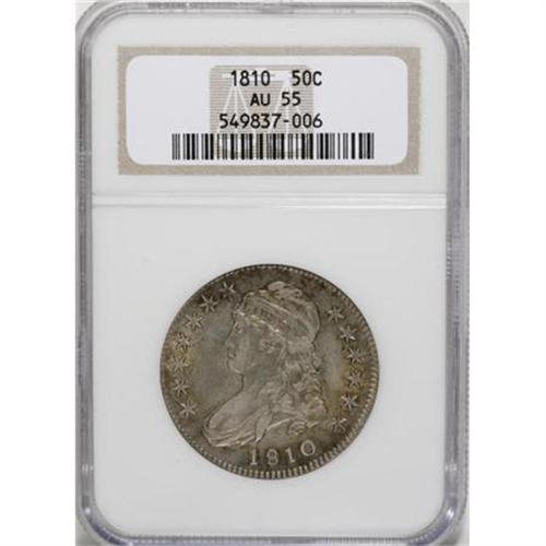 <B>1810 50C AU55 NGC.</B></I> NGC Census: (42/144). PCGS Population (50/96). Mintage: 1,276,276. Numismedia Wsl. Price for NGC/PCGS coin in AU55: $675. (#6095)<BR><BR><B>Coin Engraver:</B> John Reich<BR><BR><b>Shipping:</b> Coins & Currency (<a target="_blank" href="http://www.heritageauctions.com/common/shipping.php">view shipping information</a>)
