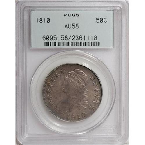 <B>1810 50C AU58 PCGS.</B></I> O-103, R.2. Deep gunmetal-gray and golden-brown toning envelops this satiny and well struck near-Mint Bust half. Pleasant smooth and boldly struck. Certified in an old green label holder.<BR><BR><b>Shipping:</b> Coins & Currency (<a target="_blank" href="http://www.heritageauctions.com/common/shipping.php">view shipping information</a>)