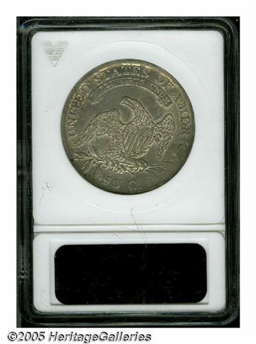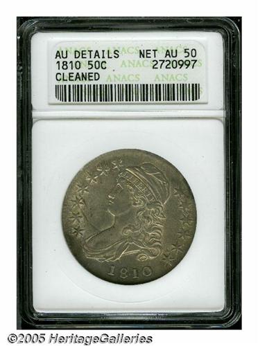 <B>1810<50C>--Cleaned--ANACS. AU Details, Net AU50.</B></I> O-110, R.2. An easily attributable variety, most easily distinguished by AM of AMERICA being joined together and M being higher, the "square" centering dot on the reverse, and the scalloped inner point of star 13. Light gray surfaces display traces of luster in the recessed areas, and a few wispy hairlines are visible on the obverse under magnification. The design elements are well defined, though some of the star centers are weak. A very nice looking coin, despite the "Cleaned" designation.