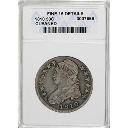 <B>1810 50C --Cleaned--ANACS. Fine 15 Details.</B></I> NGC Census: (4/365). PCGS Population (4/366). Mintage: 1,276,276. Numismedia Wsl. Price for NGC/PCGS coin in F15: $61. (#6095)<BR><BR><B>Coin Engraver:</B> John Reich<BR><BR><b>Shipping:</b> Coins & Currency (<a target="_blank" href="http://www.heritageauctions.com/common/shipping.php">view shipping information</a>)
