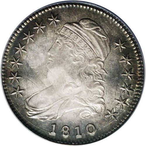 <B>1810<50C> MS60--Obverse Graffiti--NCS. Unc. Details.</B></I> O-102a, R.2. A bold die crack extends in both directions from the date, running around the rim to between stars six and seven, and between stars 12 and 13. On the reverse, a thin crack encircles most of the coin, running clockwise from the lowest arrowhead to AM in AMERICA. Even though this coin has some smoothed-out graffiti in the left (facing) obverse field, it is a lovely coin. The lustrous surfaces are toned in varying shades of blue, orange, and copper. The strike is soft on the eagle's left wing, but the claws and the right wing are sharp. Liberty's chin and neck are weak, but the star centrils are full. Both dies are moderately eroded. Examination with a glass reveals a couple of scrapes on Liberty's cheek. Envelope Included.
