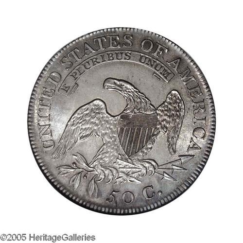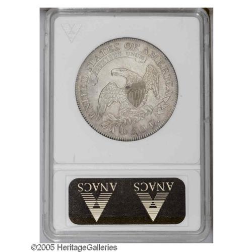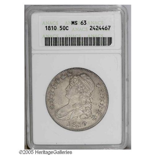<B>1810<50C> MS63 ANACS.</B></I> O-104, R.3. A die defect (lump) is seen at the upper edge of the shield, left of center, that extends down to the third crossbar. Lightly toned in silver-gray and golden shades, with few appreciable surface marks. Extremely nice quality for this early issue in addition to probable Condition Census for the die pairing.<BR><I>From The Diamond Collection, Part One.</B></I>