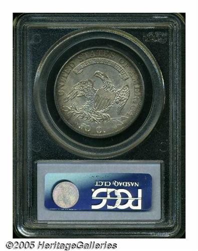 <B>1810<50C> MS63 PCGS.</B></I> O-110, R.2. An easily attributable variety, most easily distinguished by AM being joined together and M being higher, the "square" centering dot on the reverse, and the scalloped inner point of star 13. Apparently a considerable number of high grade pieces of this variety were set aside in bank vaults as reserves as the Condition Census is all MS63-65 coins. This coin is well struck in the centers with occasional softness around the margins. The light, pale golden centers deepen considerably toward the rims.