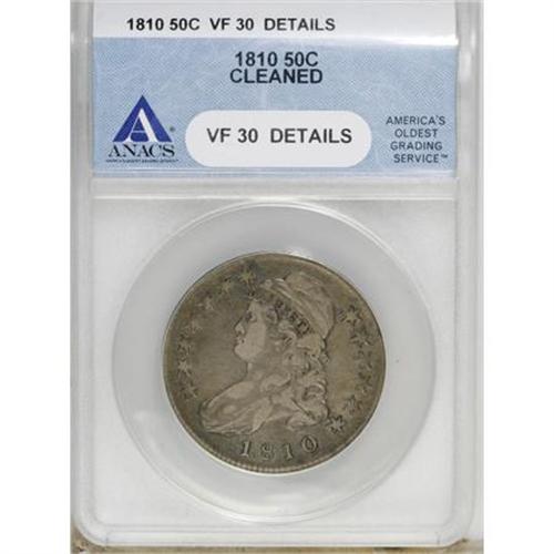 <B>1810 50C --Cleaned--ANACS. VF30 Details.</B></I> NGC Census: (15/357). PCGS Population (18/330). Mintage: 1,276,276. Numismedia Wsl. Price for NGC/PCGS coin in VF30: $150. (#6095)<BR><BR><B>Coin Engraver:</B> John Reich<BR><BR><b>Shipping:</b> Coins & Currency (<a target="_blank" href="http://www.heritageauctions.com/common/shipping.php">view shipping information</a>)