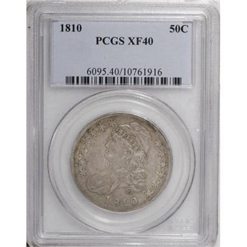 <B>1810 50C XF40 PCGS.</B></I> PCGS Population (38/266). NGC Census: (26/310). Mintage: 1,276,276. Numismedia Wsl. Price for NGC/PCGS coin in XF40: $210. (#6095)<BR><BR><B>Coin Engraver:</B> John Reich<BR><BR><b>Shipping:</b> Coins & Currency (<a target="_blank" href="http://www.heritageauctions.com/common/shipping.php">view shipping information</a>)