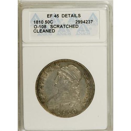 <B>1810 50C --Cleaned, Scratched--ANACS. XF45 Details.</B></I> O-108. NGC Census: (46/255). PCGS Population (32/225). Mintage: 1,276,276. Numismedia Wsl. Price for NGC/PCGS coin in XF45: $274. (#6095)<BR><BR><B>Coin Engraver:</B> John Reich<BR><BR><b>Shipping:</b> Coins & Currency (<a target="_blank" href="http://www.heritageauctions.com/common/shipping.php">view shipping information</a>\)