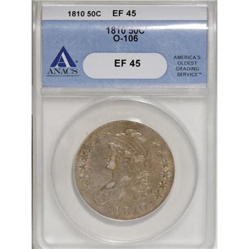<B>1810 50C XF45 ANACS.</B></I> NGC Census: (50/260). PCGS Population (37/229). Mintage: 1,276,276. Numismedia Wsl. Price for NGC/PCGS coin in XF45: $303. (#6095)<BR><BR><B>Coin Engraver:</B> John Reich<BR><BR><b>Shipping:</b> Coins & Currency (<a target="_blank" href="http://www.heritageauctions.com/common/shipping.php">view shipping information</a>)
