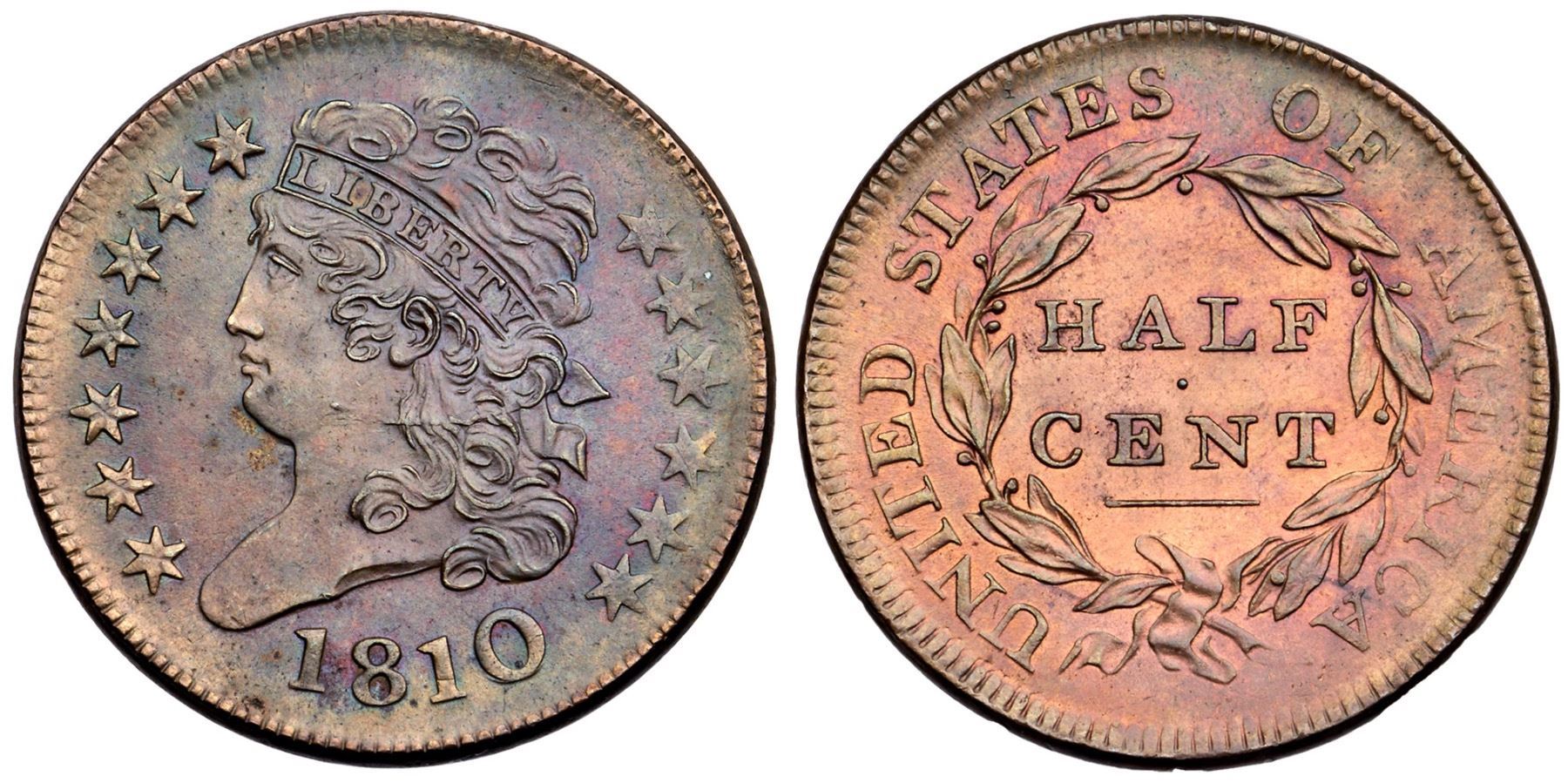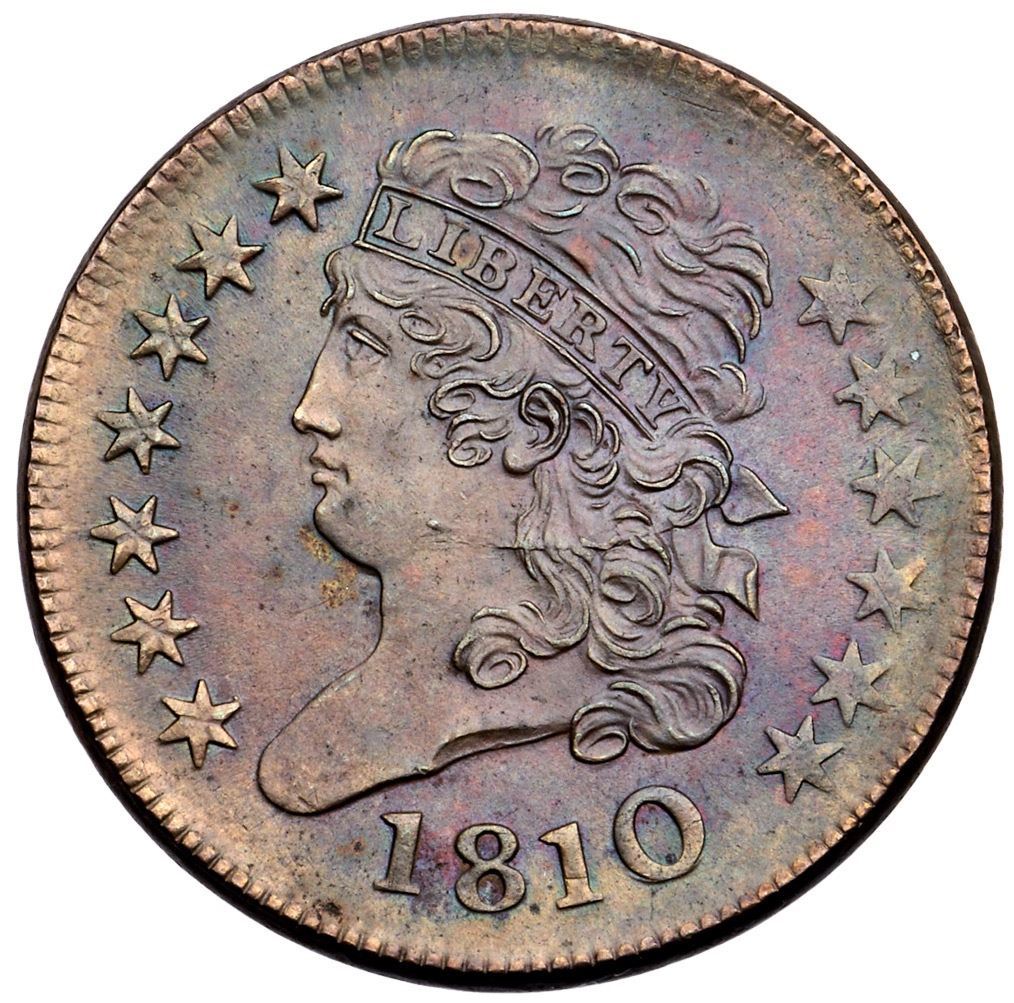 1810 C-1 R-1 MS60The obverse is lustrous bluish steel and olive brown; the reverse is very mellowed red with light bluish steel overtones. May have been lightly dipped long ago but the eye appeal is excellent. Sharply struck and nearly void of marks. The best identifying marks are a tiny planchet flake at the dentils left of the date and a small streak of slightly darker toning through the left foot of the second A in AMERICA. E-MDS. The fields are lightly flowlined but the repunching at the left base of the 0 in the date is clear. Comes with a famous provenance. Broken out of an NGC MS64BN holder with the Norweb provenance noted (310321-001 label included).Certificate Number: Pedigree: Ex; Richard Picker 8/1/1957-Norweb Family Collection, Bowers & Merena 10/12/1987:66-unknown-Heritage 12/13/2005:24-Heritage 1/9/2011:3104 -Stan New, Early Cents Auction 1/18/2025:319 - Bob Kebler Collection