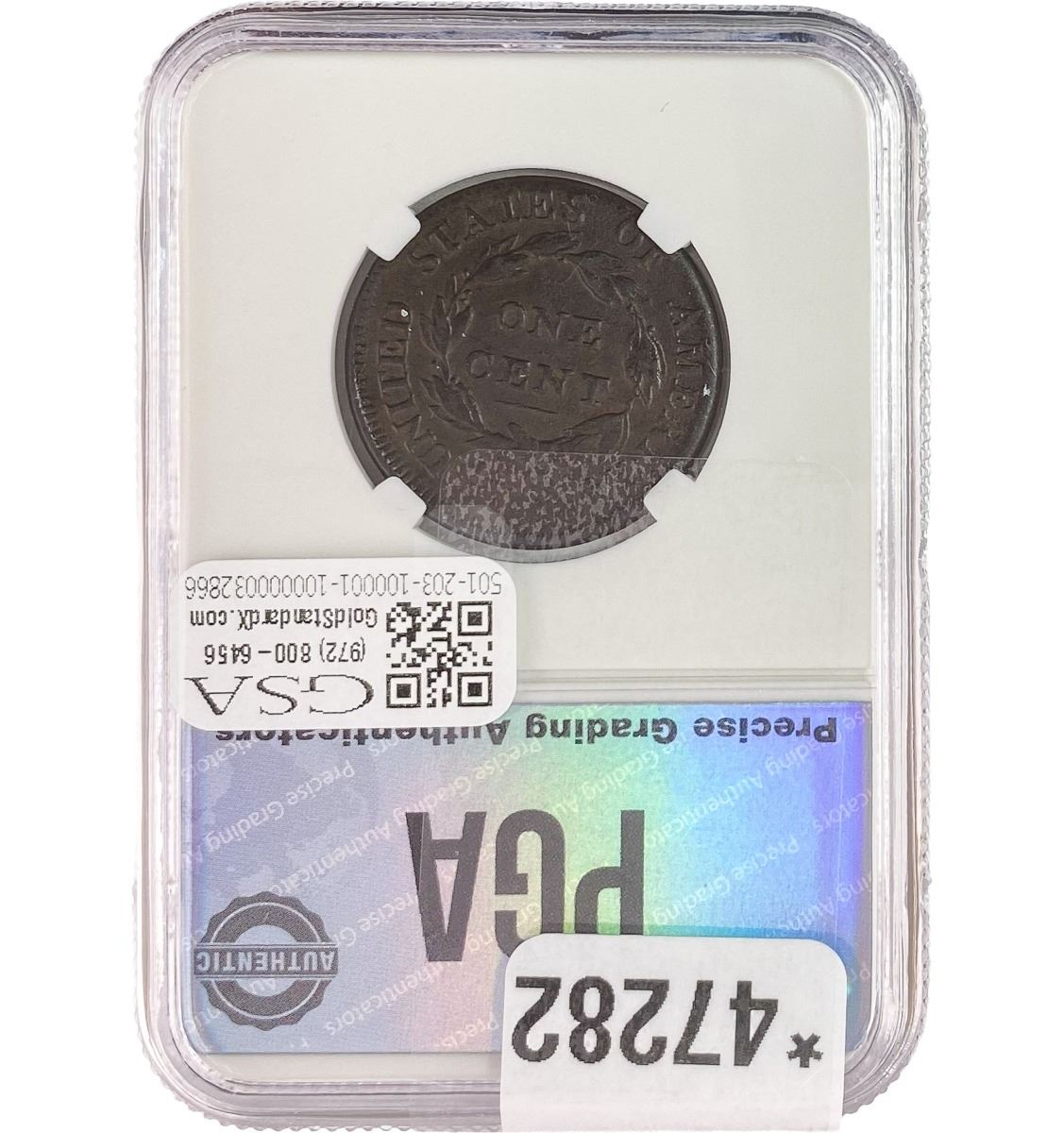 l. All non-certified coins and currency are guaranteed genuine, but are not guaranteed as to grade, since grading is a matter of opinion, an art and not a science, and therefore the description rendered by GSA or any third-party grading service may not agree with the opinion of others (including trained experts), and the same expert may not grade the same item with the same grade at two different times. GSA may, but is not obligated to, express an opinion as to non-certified numismatic items, in GSA’s opinion, or by its employees’ experience and the current interpretation of the American Numismatic Association’s standards as of the date the catalog was prepared. There is no guarantee or warranty expressed or implied that the grading opinions utilized by GSA, if any, will meet the standards of any grading service at any time in the future.