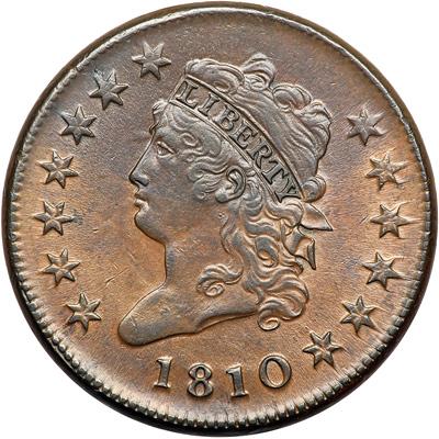1810 S-282 R2. AU-50 Plus. Turban Head. Breen Plate Coin. Lustrous blend of frosty tan faded down from mint color mixed with light chocolate brown. Great eye appeal, just a hint of wear on the highpoints and only a few trivial marks. The only notable defect is a small, shallow planchet flake at the dentils over the second A in AMERICA, as struck. Close to AU55. MDS, Breen state III. Flowlines are starting to draw the stars to the rim and clashmarks are visible inside the wreath right of ONE and CENT. The reverse is slightly misaligned to K-1.5 while the obverse is reasonably well centered on the planchet. Plated in the Breen book to illustrate the variety. Called AU50 and tied for CC#9 in the Bland census. Noyes says AU55 net AU50 but tied for CC#5, his photo #37373. Removed from a PCGS slab graded AU58 (PCGS label included, and it shows the attribution and Husak provenance). PCGS Population 1; The only one graded at PCGS for the variety. DWH #3497.
