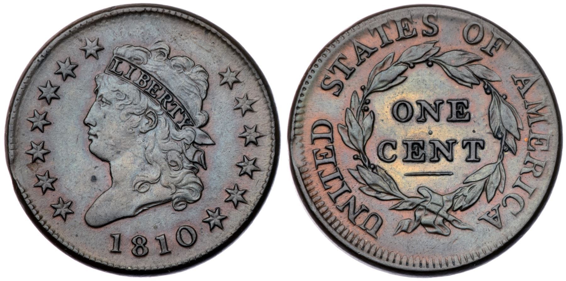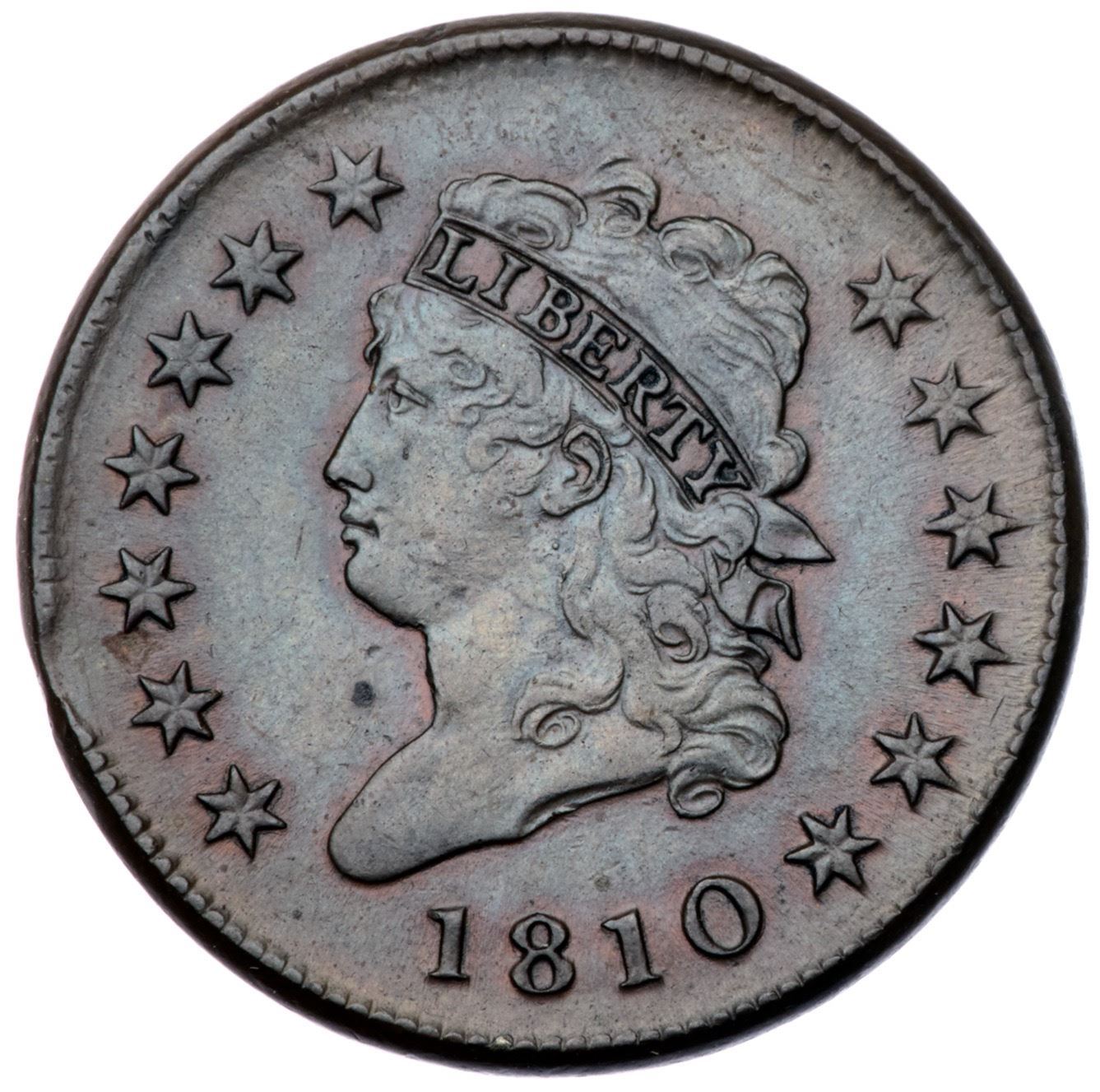 1810 S-282 R2 VF25Ten points sharper but recolored glossy light olive brown with tan and reddish brown in protected areas, mostly on the reverse. A small spot of dark verdigris in the field before the center of the neck is the only notable mark. MDS, Breen state III, with light die cracks through some of the stars. The dentil between stars 2 & 3 and over the opposing ED in UNITED are weak due to a minor planchet clip. Might benefit from a better retoning.Certificate Number: Pedigree: Ex Bill Weber 3/1981-Fred H. Borcherdt Collection