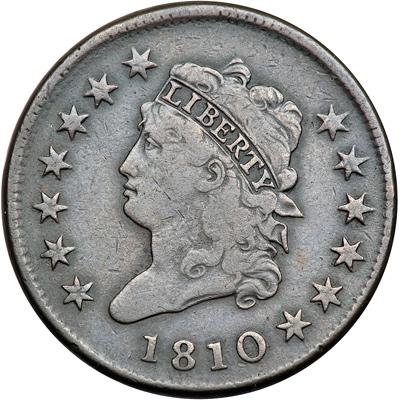 1810 S-282 R2. VG-10. Turban Head. Steel and olive brown. The surfaces are decent and appear perfectly smooth to the unaided eye, but a glass reveals uniform extremely fine roughness. No marks or verdigris. The date and legends are bold. Nice eye appeal for the grade.