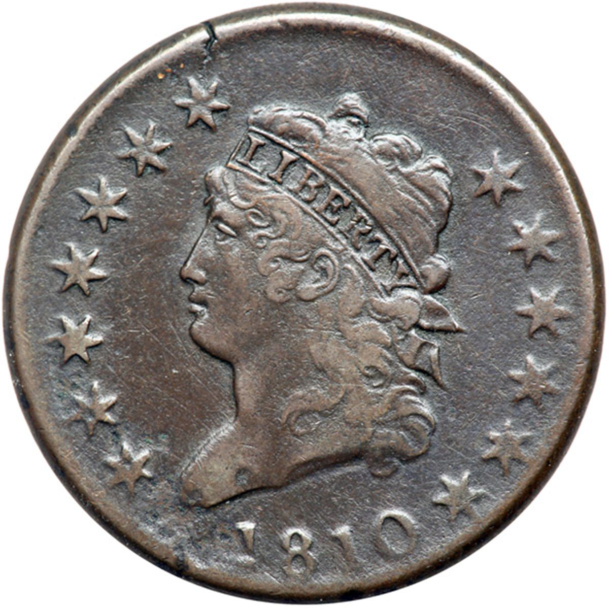1810 S-284 R3 Turban Head VG10. Sharpness VF20 with a patch of corrosion at the bust tip, faint hairline scratches in the field before the portrait, and dull rim nicks around the reverse. Glossy chocolate brown with slightly lighter brown toning on the highpoints. LDS.