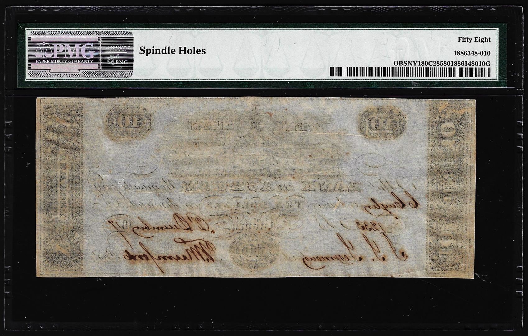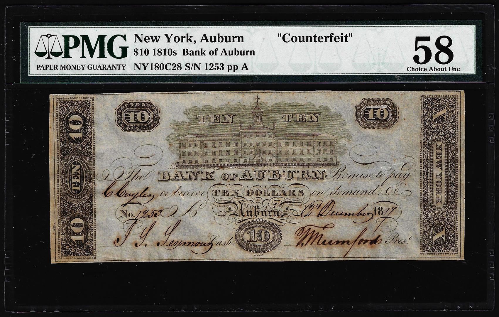 One 1810's $10 Bank of Auburn NY "Counterfeit" Obsolete Note PMG Ch. About Uncirculated 58. PMG Certified.