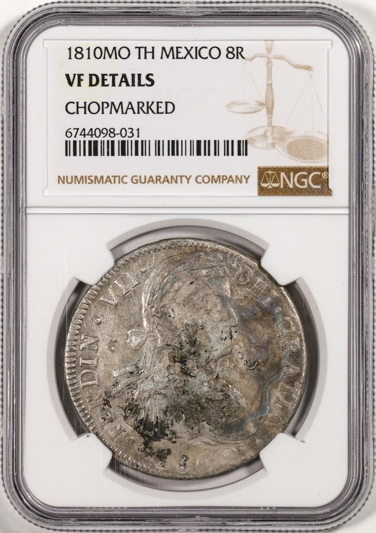 One 1810MO TH Mexico 8 Reales Silver Coin NGC VF Details Chopmarked. NGC Certified.