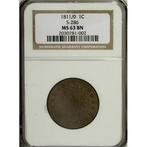 <B>1811/0 1C MS63 Brown NGC.</B></I> S-286, R.3. The only 1811/0 cent certified MS63 by either grading service, with none finer. We have had the opportunity to offer this coin for auction twice previously, and the description we used the first time we offered this piece in 1997 (when it was graded MS62) is as apt now as when it was written 10 years ago.<BR><BR>"The finest S-286 known by a wide margin, being unlisted on the Condition Census in the Noyes' reference, which lists the C.C. as 55-50-45-45-40 (multiples). This piece was apparently unknown to copper specialists until its appearance in the James A. Stack Sale in March, 1995. It was also used in the 50th anniversary edition of the <I>Guide Book ... </B></I>representing the Classic type at the top of page 85. <BR> In addition to the high grade of this piece, what is also remarkable is the presence of some underlying mint red on each side. As explained in a November 1994 issue of <I>The Numismatist</B></I> by Bob Julian, 'This variety often is seen on dark, defective planchets, which probably came into contact with saltwater on the long trip from England. (Kegs of planchets usually were stored as ballast in the ship's hold.)' However, the surfaces on this piece have a light brown caste overall with even, faded mint red that glows subtly beneath the overlay of brown patina. The striking details are well defined also with the only mentionable area of softness being on the peripheral stars on the left side of the obverse. Identifiable as the Stack coin and the Redbook plate piece by a small area of porosity on the bust of Liberty, a tiny spot in front of Liberty's mouth, and a small cut to the right of the lowest haircurl. An outstanding Classic Cent and a rare opportunity to acquire a solid Mint State coin that retains faint remnants of mint red." EAC 45.<I><BR>Ex: James A. Stack Collection (Stack's, 3/95), lot 1656; 1997 ANA Sale (Heritage, 7/97), lot 5832; 2003 Long Beach Signature Sale (Heritage, 5/03)<BR></B></I><BR><BR><B>Coin Engraver:</B> John Reich<BR><BR><b>Shipping:</b> Coins & Currency (<a target="_blank" href="http://www.heritageauctions.com/common/shipping.php">view shipping information</a>\)