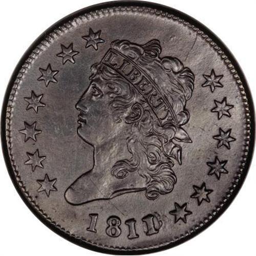 <B>1811/0 1C Overdate. AU53 PCGS. S-286, B-2, R.3.</B></I> <B>Bland XF45; tied for CC-4. Noyes XF45; tied for CC-3. Photo #34169. Our EAC Grade XF45.<BR><BR>Equivalents. </B></I>Proskey 1; Doughty 215; McGirk 1A; Clapp 1; EAC 2; <I>Encyclopedia </B></I>1782; PCGS #1558.<BR><B><BR>Variety. </B></I>Overdate. Die chip below upright of E in ONE. The obverse appears on S-286. The reverse appears on 1811 S-286 and 1812 S-291.<BR><B><BR>Surfaces. </B></I>Lovely surfaces display medium olive-brown with additional mahogany on the reverse. The obverse has faint hairlines across the bust and down from the chin, and a thin scratch from the top of the head to the border at 12:30. Traces of verdigris appear on the reverse, but otherwise the surfaces are essentially problem-free. Although imperfectly centered the strike is mostly bold, with weakness only among the stars to the left. In the Herman Halpern sale, the Stack's cataloger indicates that the surfaces may be lightly lacquered, although it is not obvious.<BR><BR><B>Die State II. </B></I>Blurry clash marks are visible within the right side of the wreath. Breen described two die states, perfect and clashed, the same states Smith described earlier. The die chip below the left side of E in ONE is constant, and remains for the later striking of 1812 S-291.<BR><BR><B>Census. </B></I>The finest piece recorded by Bland grades AU55 with two others as AU50. Noyes grades two coins AU50 and two others XF45. Top honors belongs to an example found by Dennis Steinmetz in 1994, and second best is the Noyes plate coin, considered the finest when that reference was published in 1991. The example that we sold in September 1997 is the other AU coin graded by Bland, although Noyes says that coin is just VF35. Both researchers agree that this coin grades XF45 and is solidly within the traditional Condition Census as either third or fourth finest known.<BR><BR><B>Commentary. </B></I>This reverse die is the only die in the entire Classic Head series that was used for more than one variety. The Mint produced 19 varieties, utilizing 19 obverse dies and 18 reverse dies. Not only is this variety unknown in true Mint State, it is also recorded as a separate <I>Guide Book</B></I> variety, placing additional demand on the available specimens. A receptive audience is always available when nice examples of S-286 appear on the market.<BR><BR><B>Provenance. </B></I><I>Dr. George P. French (B. Max Mehl, 1929 FPL), lot 362, $125; Henry A. Sternberg; J.C. Morgenthau (4/1933), lot 35, $16; T. James Clarke; Carl Wurtzbach; Charles R. Mathewson (6/1945); Dr. William H. Sheldon (4/1972); R.E. Naftzger, Jr. (12/1986); Herman Halpern (Stack's, 3/1988), lot 272, $4,950; Gene Reale (Sotheby's, 1/1998), lot 49, $6,325; Chris Victor-McCawley.</B></I><BR><BR><B>Personality. Julius Caesar Morgenthau</B></I> (1858-1929) founded the firm bearing his name in 1905. Earlier, in 1893, he began his career as a stamp dealer in Chicago. The auction house, located in New York City, became the premier philatelic auction house in the country by the time of his death. In 1978, Morgenthau was posthumously elected to the American Philatelic Society's Hall of Fame. The firm continued to operate after Morgenthau's death, adding numismatic auctions to its philatelic repertoire. Wayte Raymond and James Macallister conducted 53 numismatic sales for J.C. Morgenthau from 1932 until 1945. The series includes the William Festus Morgan sale of June 16, 1932 and the Howard Rounds Newcomb Collection in two parts in 1945. John Adams gives an overall A rating to eight of those sales, with seven sales assigned an A rating for large cents.<BR><BR><b>Shipping:</b> Coins & Currency (<a target="_blank" href="http://www.heritageauctions.com/common/shipping.php">view shipping information</a>)