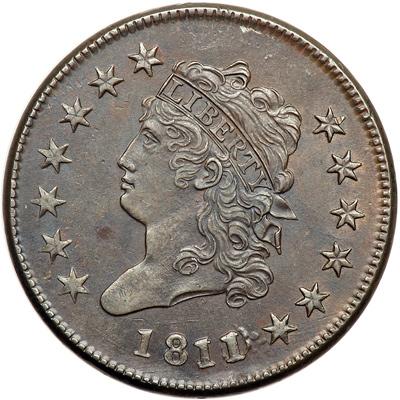 1811/0 S-286 R3 Overdate 1 over 0. PCGS Graded AU-58. Turban Head. Lustrous chocolate and lighter brown, the reverse predominately the lighter color showing traces of faded mint red in protected areas around STAT. Sharply struck and very attractive, just a hint of friction on the highest points from mint state. The only marks, and they are trivial, are a faint scuff in the field at the dentils over the head, a spot of extremely faint roughness in the field midway between the throat and star 2, and a barely visible speck of reddish carbon at the dentils under the final digit in the date. E-MDS, Breen state II, with blurry die clashmarks inside the right edge of the wreath. Called AU55 net AU50 and tied for CC#1 in the Noyes census, his photo #38132. Bland says AU55 and alone at CC#1. Either way, this is as good as it gets for this scarce and very popular "Redbook" overdate variety. Removed from an NGC slab graded MS61BN (NGC label included, and it shows the Rasmussen provenance). NGC population 1; 1 finer in MS62; 1 finer in MS63 at NGC for the variety. DWH #3400.