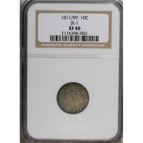 <B>1811/09 10C XF40 NGC.</B></I> JR-1, R.3. The only dies for this underappreciated date. The obverse has iridescent aqua-blue, peach, and lilac toning. The reverse is slate-gray with a golden-brown border. A curved mark is noted from the eagle's head to the first A in AMERICA. Census: 3 in 40, 32 finer (6/07).<BR><BR><B>Coin Engraver:</B> John Reich<BR><BR><b>Shipping:</b> Coins & Currency (<a target="_blank" href="http://www.heritageauctions.com/common/shipping.php">view shipping information</a>\)