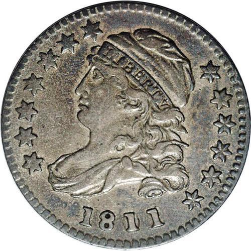 <B>1811/09<10C> JR-1, R.3. Reiver state a. XF45 NGC.</B></I> Dark gray with even darker highlights in the fields. Boldly struck by the dies and reasonably attractive for this date. The surfaces are very clean, and rarely are found so well preserved on these small early silver coins.<BR> This is a very early die state for the 1811 dime, the obverse held up well for the entire issue with a single die crack seen to the 8 in the date on later die states, but the reverse is usually found shattered. First used to coin the entire 51,065 pieces dated 1809, the reverse was again employed in 1811 to coin an additional 65,180 pieces. Few dies from this period survived to strike anything approaching 100,000 coins, and this reverse die shattered early during the production of 1811 coinage. On this particular coin there is a faint die crack which arcs down through the A in STATES to the eagle's head and wing, and out the rim through the right foot of the R in AMERICA. Another faint die crack extends horizontally through the final A of AMERICA to the eagle's right wing tip and claw. A final die crack is seen from the rim down through the first A of AMERICA into the scroll. These cracks are all in the early stage of development, as compared to the extensive die cracks found on the later die states of this issue.<BR><I>No pedigree information included.</B></I> Envelope Included.
