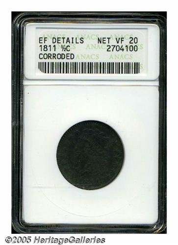 <B>1811<1/2 C>--Corroded--ANACS. XF Details, Net VF20.</B></I> B-2, C-2, Low R.3. A difficult date, as only two die marriages exist and each is scarce. Nicely detailed, but dark and porous, with noticeable corrosion near the peripheries, on both obverse and reverse. All legends are bold. A very scarce date in all grades.