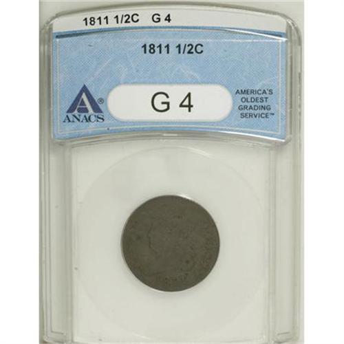 <B>1811 1/2 C G4 ANACS.</B></I> NGC Census: (2/30). PCGS Population (3/95). Mintage: 63,140. Numismedia Wsl. Price for NGC/PCGS coin in G4 : $175. (#1135)<BR><BR><b>Shipping:</b> Coins & Currency (<a target="_blank" href="http://www.heritageauctions.com/common/shipping.php">view shipping information</a>)