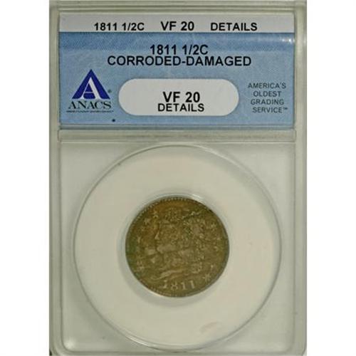 <B>1811 1/2 C --Corroded, Damaged--ANACS. VF20 Details.</B></I> NGC Census: (3/17). PCGS Population (8/55). Mintage: 63,140. Numismedia Wsl. Price for NGC/PCGS coin in VF20: $1,450. (#1135)<BR><BR><B>Coin Engraver:</B> John Reich<BR><BR><b>Shipping:</b> Coins & Currency (<a target="_blank" href="http://www.heritageauctions.com/common/shipping.php">view shipping information</a>)
