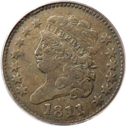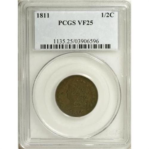 <B>1811 1/2 C VF25 PCGS.</B></I> C-2, B-2, Low R.3. Easily distinguished by the repunched I, E, R, and Y of LIBERTY. This deep yellow-tan example displays blushes of sky-blue and lilac. Nice detail shows in the design features, though the star centers are typically flat. A few trivial marks scattered about are consistent with a moderately circulated coin. Great technical quality for the grade. EAC 15.<BR><BR><B>Coin Engraver:</B> John Reich<BR><BR><b>Shipping:</b> Coins & Currency (<a target="_blank" href="http://www.heritageauctions.com/common/shipping.php">view shipping information</a>)