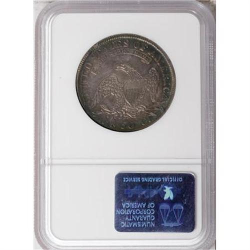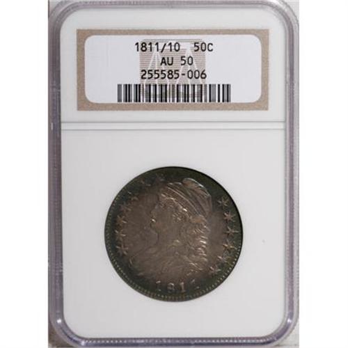 <B>1811/10 50C AU50 NGC.</B></I> O-101, R.1. Ocean-blue and olive toning invigorates the borders. The fields and devices are golden-gray. The reverse rim is nicked at 10:30, but there are no other remotely relevant marks, and the portrait shows only moderate wear.<BR><BR><b>Shipping:</b> Coins & Currency (<a target="_blank" href="http://www.heritageauctions.com/common/shipping.php">view shipping information</a>)