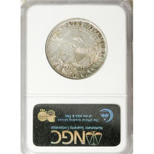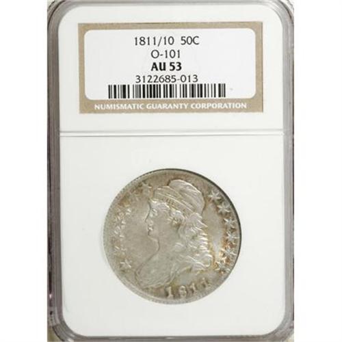 <B>1811/10 50C AU53 NGC.</B></I> O-101, R.1. Light gray surfaces with considerable luster on each side, accompanied by splashes of gold and sea-green toning.<BR><BR><B>Coin Engraver:</B> John Reich<BR><BR><b>Shipping:</b> Coins & Currency (<a target="_blank" href="http://www.heritageauctions.com/common/shipping.php">view shipping information</a>)