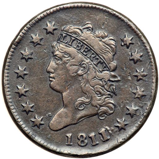 1811/10 S-286 R3 Overdate 11 over 10 Turban Head F12. Sharpness VF20 or a bit better but there are numerous dull rim nicks on both sides, especially on the reverse, plus a collection of tiny nicks on the right side of the obverse. The planchet is smooth except for a small spot of raised verdigris in the field close over the bust tip plus additional fine verdigris or crud nestled around the lower part of CENT. Mostly glossy chocolate brown and steel with puffs of darker chocolate toning on the reverse. E-MDS, Breen state I. The date is bold and the overdate feature is obvious.