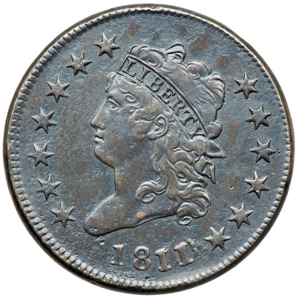 1811/10 S-286 R3 Overdate 11 over 10 VF20. Turban Head. Sharpness EF40 but the obverse of this cent was lightly burnished to minimize microscopic roughness. The only marks are a small spot of very shallow reddish verdigris on the truncation over the 8 and a tiny rim bruise at the M in AMERICA. Mostly glossy dark olive brown and steel with lighter chocolate toning on the highpoints of the obverse. Nicely struck EDS, Breen state I. The overdate feature is strong.