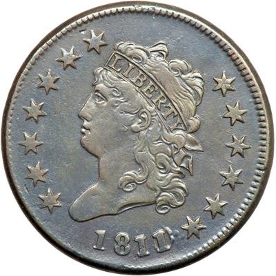 1811/10 S-286 R3. VF-20. Overdate 11 over 10. Turban Head. Glossy olive and dark bluish steel, possibly lightly cleaned and retoned. No marks or roughness, and the eye appeal is quite nice in spite of the retoning. MDS, Breen state II, with clear die clashmarks inside the wreath. The overdate feature is clear.