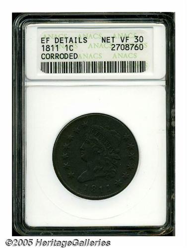 <B>1811<1C>--Corroded--ANACS. XF Details, Net VF30.</B></I> S-287, R.2. Heavy corrosion blankets each side, as mint-green and rose accents are evident over the charcoal-colored surfaces. The piece is evenly worn and abrasion-free.