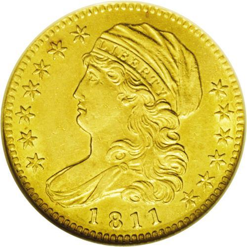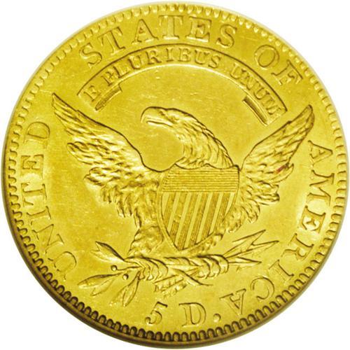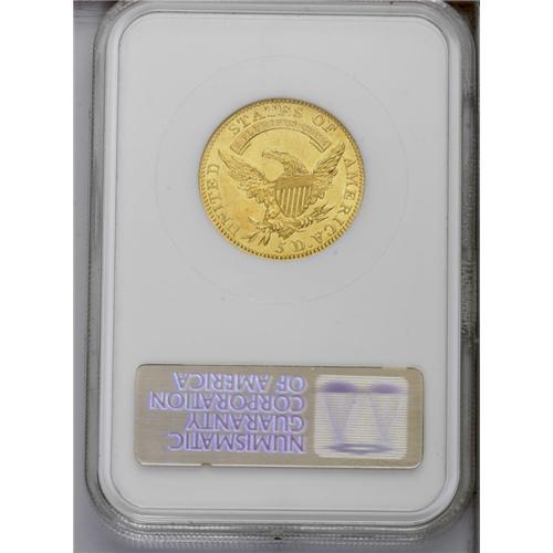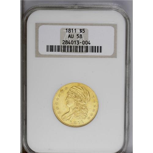 <B>1811<$5> AU58 NGC.</B></I> Small 5, B. 1-B, Breen-6464, Miller-116, High R.3. The 5 in the denomination is small and narrow, and close to the D and the fletchings. A well struck and fairly well centered example, this piece has lovely orange-gold surfaces. A small scrape is noted beneath Liberty's eye, but otherwise there are no mentionable abrasions. A nice, near-Mint State example.<BR><I>From The Antigo Collection.</B></I>