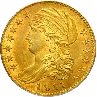 1811 $5 Capped Draped Bust. Small 5 BD-2, Rarity 3. PCGS graded MS-63. Well struck and frosty, all moderately toned with some trace adjustment across the cheek. Minor surface marks are visible on most early half eagles in this condition, but we had to search hard to find a few in the field around the eagle, and these are insignificant. This is the more common of two die varieties for 1811, both offered in the present sale. Both were struck from a single obverse die paired with two different reverse dies.