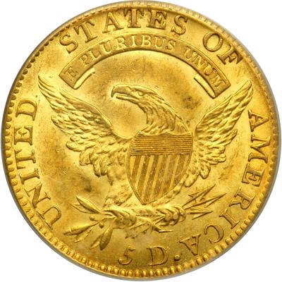 This Capped Draped Bust Left format, which debuted in 1807 on the half eagle, was continued through 1812. The brief span of this design yielded a coinage estimated at 399,013 pieces. Although there are some scarce die varieties within the 1807-12 years, there are no rare dates. The type set collector can pick and choose from virtually any date desired. What's more, coins are available in all grades, with Very Fine to About Uncirculated coins predominating and available with some frequency (relatively speaking, of course). Mint State examples are offered now and then and, if choice in appearance, like the present MS63 1811 Small 5, are highly prized. These typically have frosty rather than prooflike surfaces. Pop 37; 13 finer in 64 (PCGS # 8109).