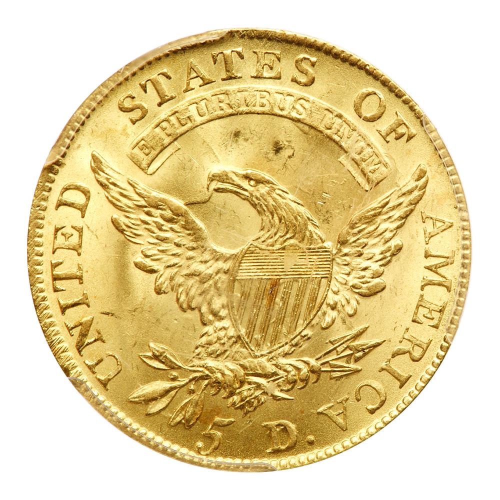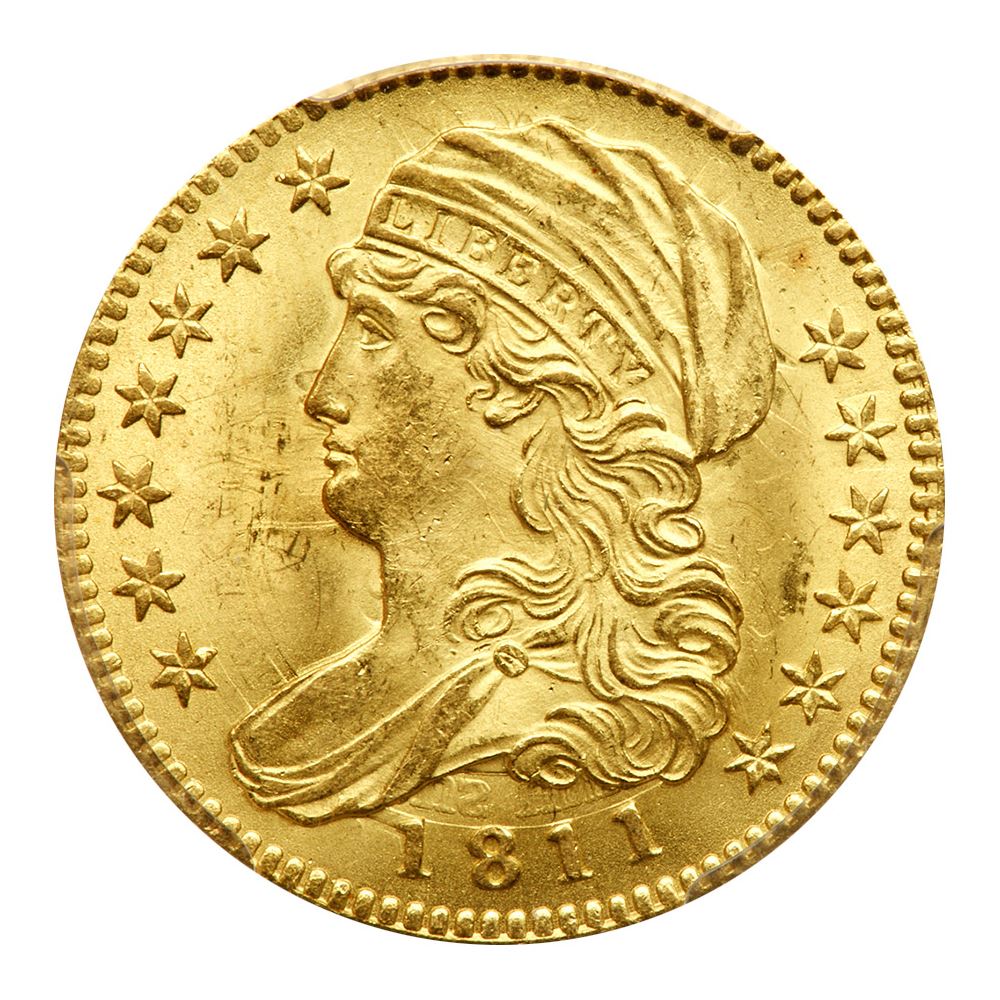 1811. Tall 5. PCGS graded MS-65. This is an amazing coin. First off, despite a mintage of 99,581 pieces struck only 225 have survived to today according to CoinFacts. This example is one of the top three reported, just a point below the MS-66 and finest from the Pogue Collection in that sold in 2016. Boldly struck on all of Libertys curls and the stars, as well as on the eagles feathers and legends surrounding them. Both dies show bold clashing evidence in the fields. Frosty and untoned with glittering luster and struck in classic bright yellow gold. The surfaces are simply amazing to examine, with nary any signs of handling to be found, and no distracting adjustment marks. An incredible Gem early half eagle that will stand tall in even the most advanced collection. Pop 2; 1 finer in 66. PCGS # 8110 Estimated Value 80,000 - UP