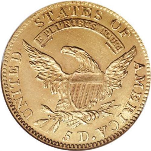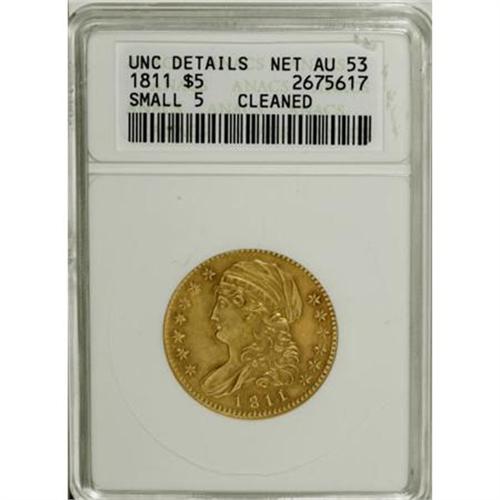 <B>1811 $5 Small 5--Cleaned--ANACS. Unc Details, Net AU53.</B></I> Breen-6464, BD-2, R.3. Distinguished by the recut C in AMERICA as well as the space (or lack of it) between the 5 and D in the denomination. The brightness from cleaning is largely subdued by the passage of time now and each side shows a light overlay of reddish-orange patina. Significant mint luster surrounds the devices, especially on the reverse. Sharply struck with no mentionable abrasions.<BR><BR><BR><B>Coin Engraver:</B> John Reich<BR><BR><b>Shipping:</b> Coins & Currency (<a target="_blank" href="http://www.heritageauctions.com/common/shipping.php">view shipping information</a>\)