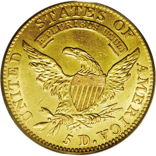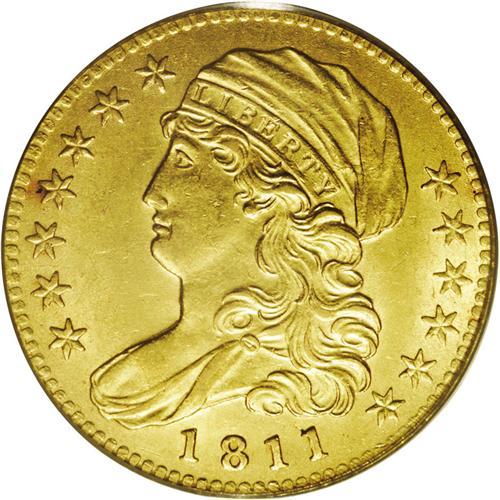 <B>1811<$5> Small 5 AU55 PCGS.</B></I> Breen-6464, B. 1-B, Miller-116, High R.3. Nicely struck with rich yellow-gold coloration and no actual signs of circulation, just a hint of friction on the highpoints of obverse. An ideal type coin candidate, free from adjustment marks or unsightly abrasions.