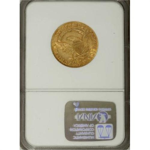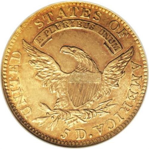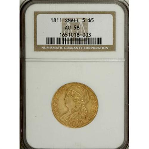 <B>1811 $5 Small 5 AU58 NGC.</B></I> Breen-6464, BD-2, R.3. The Small 5 variety is slightly more common than the Tall 5 reverse, but neither is rare. Die state study of the 1811 half eagles is still in its infancy. Considerable study and documentation is necessary to determine the order that these two varieties were coined, or even if any other issues were produced at the same time. The Tall 5 (BD-1) variety uses the same reverse of the 1810 Tall 5 (BD-1) variety. The Small 5 was only used for this 1811 BD-2 variety, and a single 1811 obverse was used for both varieties. Logic suggests that the 1810 half eagles were coined before the 1811 pieces, but some could have been struck after the first 1811 variety. Sharp design details and remarkable green and orange-gold color are hallmarks of this example. A few faint scratches and other insignificant imperfections are visible.<BR><BR><B>Coin Engraver:</B> John Reich<BR><BR><b>Shipping:</b> Coins & Currency (<a target="_blank" href="http://www.heritageauctions.com/common/shipping.php">view shipping information</a>\)