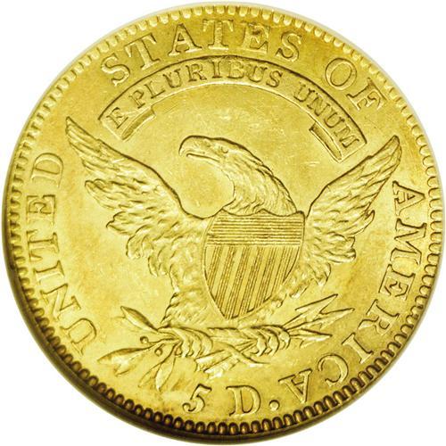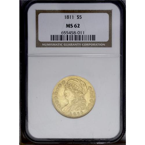 <B>1811<$5> Small 5 MS62 NGC.</B></I> Breen-6464, B. 1-B, Miller-116, High R.3. A sharply struck and attractive green-gold example with frosty luster. The surfaces on both sides are moderately abraded, keeping this example from a higher grade. Among coins of this design type, this date is rather plentiful, with 200 to 300 examples of this variety known, and a similar number of the other variety with a Tall 5 in the denomination. <BR><BR><B>Important notice:</B> Heritage usually auctions material at the rate of 200-250 lots per hour. On some occasions eBay Live bid software or the Internet may not be able to keep up with the pace of the auction. We recommend placing a realistic absentee bid now as insurance to avoid disappointment. Occasionally the auctioneer may eliminate or reject an eBay Live bid, and the auctioneer may also reopen a lot after the close of the eBay live bidding (usually because we missed an audience bid), and may reject your bid even if it shows you as the winning bidder. By bidding via eBay Live, you agree that Heritage may award the lot to another bidder at its sole discretion under the circumstances described above or any other reasonable circumstances. Since eBay bids are not shown to us until we open the lot on the floor, we treat those bids just like floor bids. In most cases the floor responds before the eBay bid is presented to us, due to Internet lag time, so for consistency we have made it a policy that floor bids are always considered first over tie eBay live bids. Also please note that all Heritage lots purchased through eBay Live carry a 20% Buyer's Premium. Please make sure you read the Terms and Conditions before you bid. This lot is being auctioned in conjunction with a live floor auction by Heritage Galleries & Auctioneers. All final auction and invoice information will be supplied by Heritage Galleries & Auctioneers, and all other information should be considered preliminary. Lot:2628 <BR><BR><B>Winning Notification and Billing:</B> After the FINAL session in this auction is complete, Heritage will send e-mail and snail mail invoices. This process normally takes several days. All final auction and invoice information will be supplied by Heritage Galleries & Auctioneers, and all other information should be considered preliminary. <BR><BR>This auction will be conducted on a live auction floor and over the Internet through eBay Live. If you choose to place an absentee bid, please take a moment to <font color='#0000ff'><u><a href='http://pages.ebay.com/liveauctions/help/before/laabsentee.html'>learn how eBay Live absentee bidding works</a></u></font><font color='#000000'>