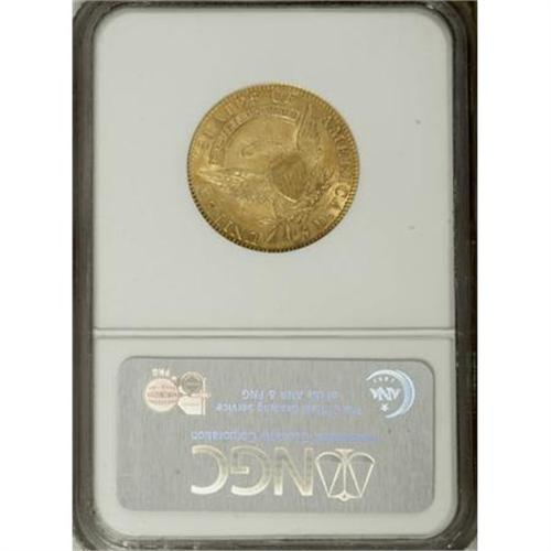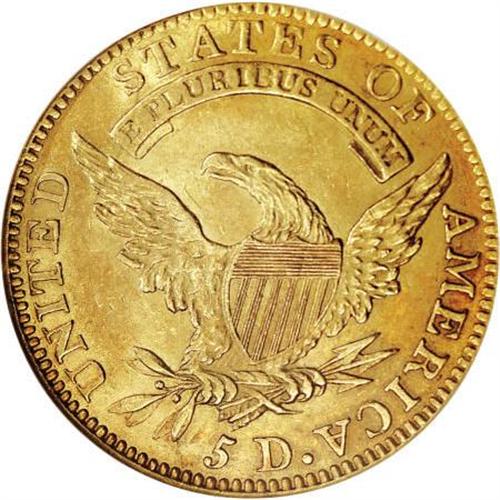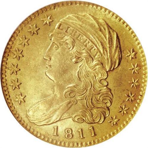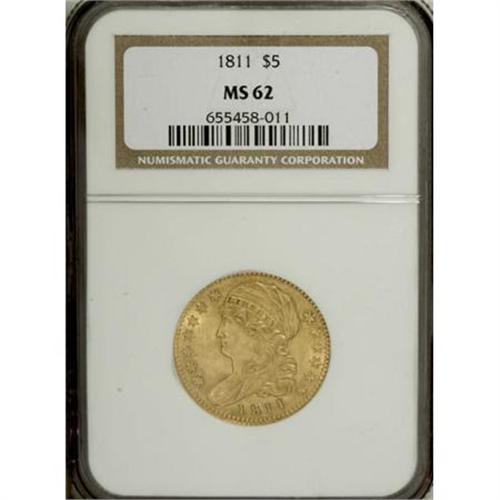<B>1811 $5 Small 5 MS62 NGC.</B></I> Breen-6464, B. 1-B, Miller-116, High R.3. A sharply struck and attractive green-gold example with frosty luster. The surfaces on both sides are moderately abraded, with no marks that deserve individual mention. All in all, this is a pleasing Uncirculated type coin with a well-balanced appearance from side to side. Among coins of this design type, this date is rather plentiful, with 200 to 300 examples of this variety known in all grades, and a similar number of the Tall 5 variety. However, the population starts to thin out considerably at the MS62 level. Census: 41 in 62, 47 finer (6/07).<BR><I>From The Julian Collection.</B></I><BR><BR><B>Coin Engraver:</B> John Reich<BR><BR><b>Shipping:</b> Coins & Currency (<a target="_blank" href="http://www.heritageauctions.com/common/shipping.php">view shipping information</a>\)