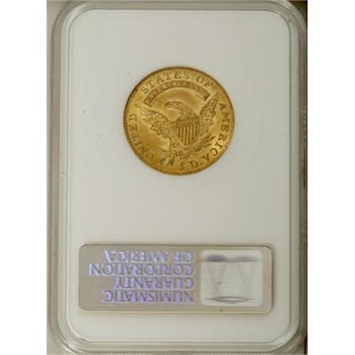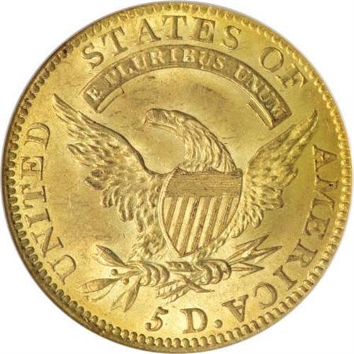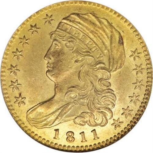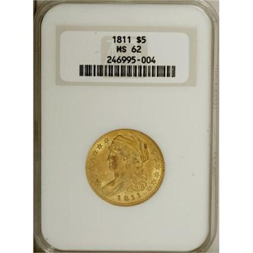 <B>1811 $5 Small 5 MS62 NGC.</B></I> Breen-6464, BD-2, R.3. Both varieties for the year (Tall 5 and Small 5 reverses) share an obverse die; the small 5 with the feather tip over the flag of the 5 in the closely spaced denomination is diagnostic for this reverse. John Dannreuther and Harry Bass, Jr., in their <I>Early U.S. Gold Coin Varieties</B></I>, estimate 225 to 300 examples of the variety extant. They also note that neither of the two 1811 varieties is scarce, within the context of the series, and both appear with frequency at auction. This should not be construed, however, that the Capped Bust Left half eagle is common, especially in Mint State.<BR> Our MS62 offering here exhibits sharply struck design elements. The yellow-gold surfaces display hints of green and orange, and the luster is intense, but the flow is disrupted in a few places. A few grade-consistent marks are scattered over each side.<BR><I>From The Parker Lee III Collection.</B></I><BR><BR><B>Coin Engraver:</B> John Reich<BR><BR><b>Shipping:</b> Coins & Currency (<a target="_blank" href="http://www.heritageauctions.com/common/shipping.php">view shipping information</a>)
