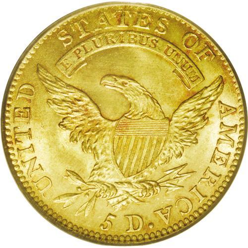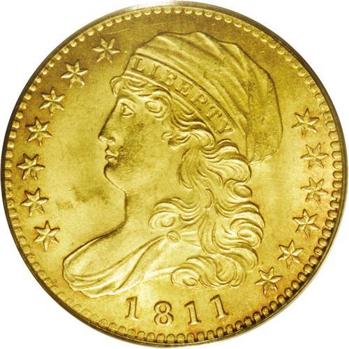 <B>1811<$5> Small 5 MS64 PCGS.</B></I> Breen-6464, B. 1-B, Miller-116, High R.3. The 1811 has a mintage of slightly less than 100,000 pieces. This production was about evenly divided between two <I>Guide Book</B></I> varieties, the Small 5 and Large 5. These refer to the size of the punch used to enter the denomination. The Small 5 can also be identified by the C in AMERICA, which is clearly repunched at the base. Regardless of variety, the 1811 is very scarce today, although collectible in Mint State for those with sufficient resources, and the patience to wait for a piece of suitable quality to arrive at auction. All gold coins from this era are elusive. The United States used a ratio of gold to silver that undervalued gold, relative to European trade. As a result, Capped Bust gold coins did not circulate, and were instead exported to Europe, where they were melted and recoined. Although most unimpaired survivors are in XF or better grades, pieces with full mint luster throughout the fields are rarely encountered, probably due to indifferent storage. The present near-Gem has full luster, and the cheek and left obverse field show only faint grazes from long ago movement against peers. The strike is intricate, and the occasional hints of golden-brown patina further confirm the originality. Traces of adjustment marks are localized to the upper reverse legends, and will not even be noticed by most viewers. The overall eye appeal is formidable, and this example would serve as the highlight of even an advanced early gold collection. Encapsulated in a green label holder. Population: 12 in 64, 0 finer (4/06).