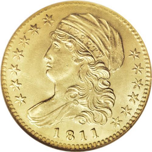 <B>1811 $5 Small 5 MS65 NGC.</B></I> Breen-6464, BD-2, R.3. As a date, the 1811 is a relatively common member of the Capped Bust Left series of half eagles, being of similar difficulty in Uncirculated grades as the 1807 and 1812, and only slightly more challenging than the 1809/8 and 1810. Jeff Garrett and Ron Guth write in their <I>Encyclopedia of U.S. Gold Coins:</B></I> "This is one of two major varieties for the year, and it is seemingly the more common of the two varieties. However, a surprising number of Mint State examples are known, including a fair number of MS63 coins, making this one of the more affordable examples of this type in Uncirculated condition."<BR> The presently offered specimen is undoubtedly the nicest we have ever had the privilege of auctioning. Not only are the vibrant green-gold surfaces alive with satiny, frosted luster, but the strike is profoundly bold in virtually all areas. A pinpoint mark on Liberty's cheek is centrally placed, yet so small as to be invisible to the naked eye, and trivial planchet flaking between the eagle's beak and left wing has no effect on the coin's technical status. Magnificent quality, not just for the issue, but as a Capped Bust Left half eagle of any date. The reverse has faint die cracks joining the tops of a few letters, but these are the only die defects noted on either side, other than faint clash marks below Liberty's ear. Census: 5 in 65, 1 finer (4/07).<BR><BR><b>Shipping:</b> Coins & Currency (<a target="_blank" href="http://www.heritageauctions.com/common/shipping.php">view shipping information</a>)