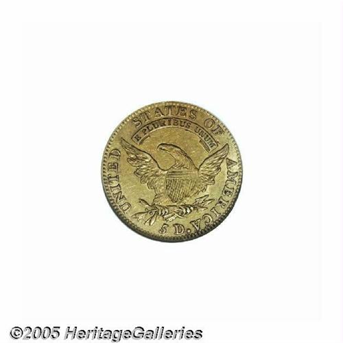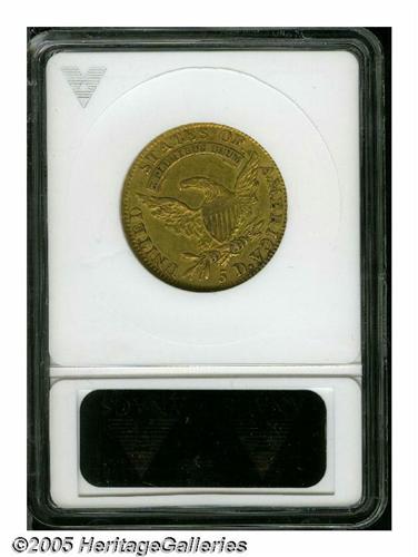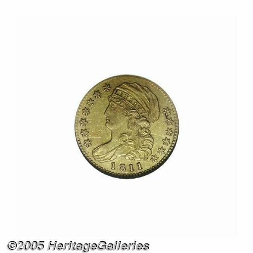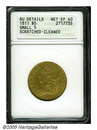 <B>1811<$5> Small 5--Scratched, Cleaned--ANACS. AU Details, Net XF40.</B></I> Breen-6464, B. 1-B, Miller-116, High R.3. A crisply struck and lightly circulated olive-gold piece that has faint adjustment marks at 11 o'clock. Wispy hairlines are on both sides but more prominent on the obverse. Two lengthy pinscratches intersect on the cheek, and the left obverse field has a large wavy pinscratch.