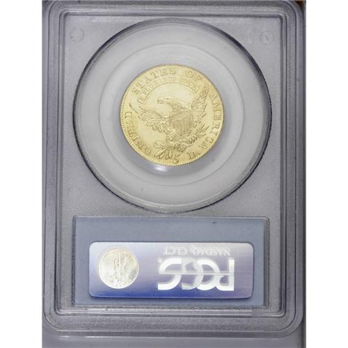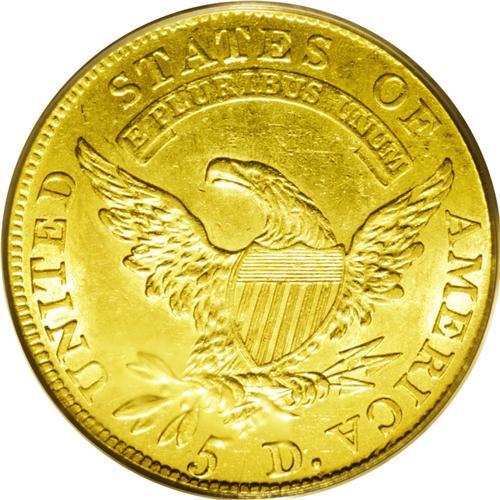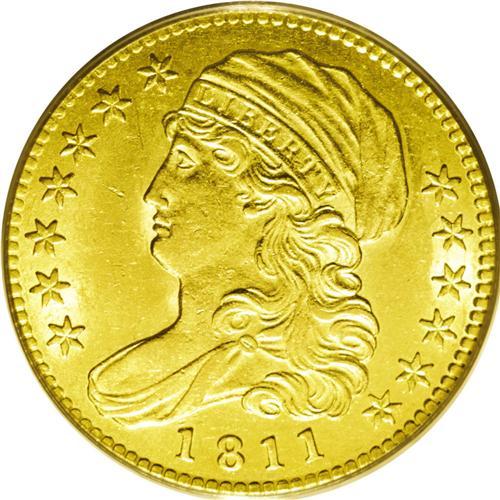 <B>1811<$5> Tall 5 AU58 PCGS.</B></I> B. 1-A, Breen-6463, Miller-115, R.4. Just a touch of wear on the highpoints of each side separates this coin from Mint State. This greenish-gold example is well struck and well centered, with excellent luster radiating boldly outward. Save for a noticeable tick in the left obverse field before Liberty's nose, there are no singular abrasions. Population: 7 in 58, 30 finer (7/06).