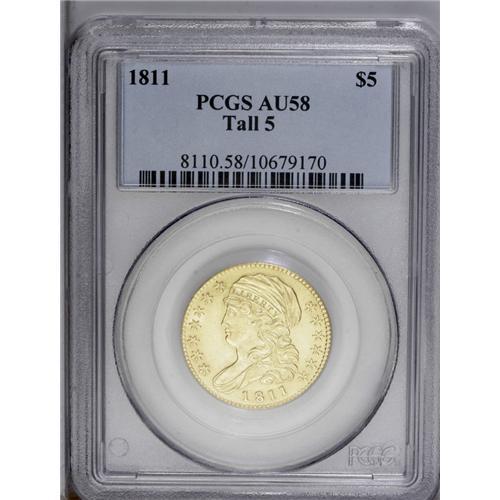 1811 $5 Tall 5 AU58 PCGS. Breen-6463, B. 1-A, Miller-1